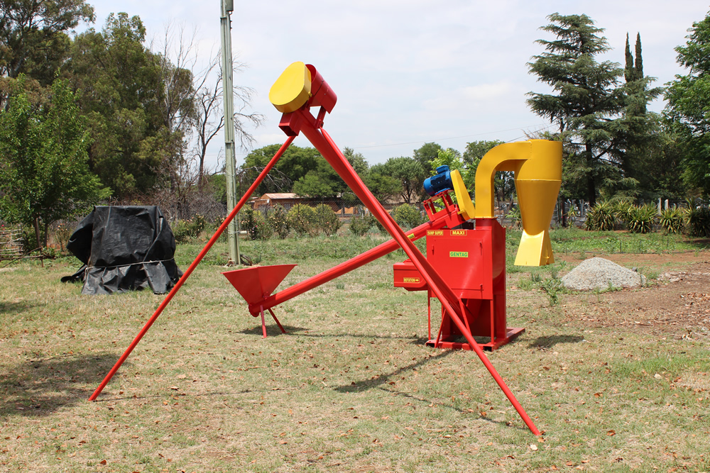 A radial Centrifugal fan is used to increase the kinetic energy in the air. The air duct is fitted with a controllable air damper to allow for adjusting and controlling the correct amount of air needed to blow and separate the Husk and Germ from the Maize Kernel. The Husk and Germ are blown into a Cyclone where it is bagged. Much as effective is a 180°outlet chute that delivers same into bags or Conveying Auger.